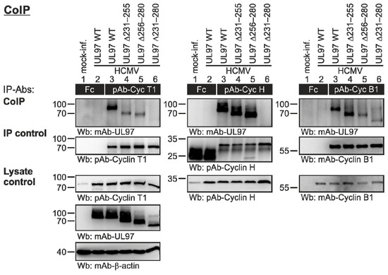 In the first step, the pattern of pUL97 interaction with cellular cyclins was analyzed by CoIP experiments. To this end, HCMV-infected cells were lysed at 4 d.p.i. and subjected to cyclin-specific CoIP using pAb-cyclin T1, pAb-cyclin H or pAb-cyclin B1, respectively (Figure 3). Lysate control stainings indicated that the level of pUL97 expressed by the ∆231–280 recombinant virus was lower than WT, so that the protein may have some reduced stability due to the short deletion. As expected from the previous work, HCMV UL97 ∆231–280 showed a lack of cyclin T1 interaction (Figure 3, left upper panel, lane 6, compare to WT in lane 3), and both partial deletion mutants, ∆231–255 and ∆256–280, showed also here an intermediate phenotype with reduced cyclin T1 interaction (Figure 3, lanes 4–5). Moreover, mutant UL ∆231–280 also showed a defect in the interaction with the cyclin H (Figure 3, central upper panel, lane 6), while ∆231–255 and ∆256–280 showed preservation of the WT-like, strong cyclin H interaction. In contrast, cyclin B1 interaction was positive in all cases, whereby ∆231–280, and also ∆256–280, produced reduced CoIP signal intensity compared to WT and mutant ∆231–255. The CoIP results are considered in line with the replication kinetics, in that the largest deletion showed the most pronounced impairment of cyclin binding activity, while the two smaller deletions were found to be intermediate. Combined, these data strongly argue for a binding defect of pUL97 expressed by HCMV UL97 ∆231–280 for the functionally related cyclins T1 and H, but not for cyclin B1, or only to a lesser extent.