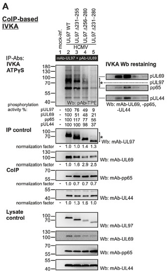 In order to analyze the properties of pUL97-mediated auto- and substrate phosphorylation, a CoIP-based in vitro kinase assay (IVKA) was performed. To this end, HFFs were infected with the parental HCMV WT or one of the three UL97 deletion mutants. Total cell lysates were subjected to IP using antibodies against pUL97 and pUL69, representing one of the major pUL97-specific substrates. Two other viral substrates, pp65 and pUL44, were detected as additional CoIP targets. The quantities of intracellular expression of pUL97 and pUL69 (Figure 4A, panels of lysate control) as well as their immunoprecipitates (Figure 4A, panels IP control) showed lower levels for deletion mutants ∆231–280 and ∆256–280 compared to WT and ∆231–255, thus reflecting the delay in replication kinetics (compare Figure 2). Interestingly, the two additional viral early proteins pp65 and pUL44 did not show this mutant-specific expression pattern. Quantitative values of band intensities were determined by densitometry of the Wb filters, defining the WT level as 100% and using this factor of normalization for the relative calculation of protein levels. Phosphorylation-specific bands (Figure 4A, panel IVKA ATPγS) were verified by a restaining of the IVKA Wb filters using monospecific antibodies as indicated. Notably, the pUL97 autophosphorylation as well as the phosphorylation of all three analyzed viral substrates showed a strong reduction for the largest deletion ∆231–280, a partial reduction for ∆256–280 and almost no reduction versus WT for ∆231–255 (Figure 4A, lanes 5, 4, 3 and 2, respectively). For mutant ∆231–280, the normalized levels of reduced phosphorylation signals were down to 9% or 21% for the two IP proteins pUL97 and pUL69, and 56% or 37% for the two CoIP proteins pp65 and pUL44, respectively. This mutant-specific reduction is considered a combined effect of two parameters, namely reduced phosphorylation, on the one hand, and reduced abundance of the proteins in the kinase complexes, as illustrated by the descending presence of protein bands in the IVKA Wb restaining (Figure 4A, right panels).