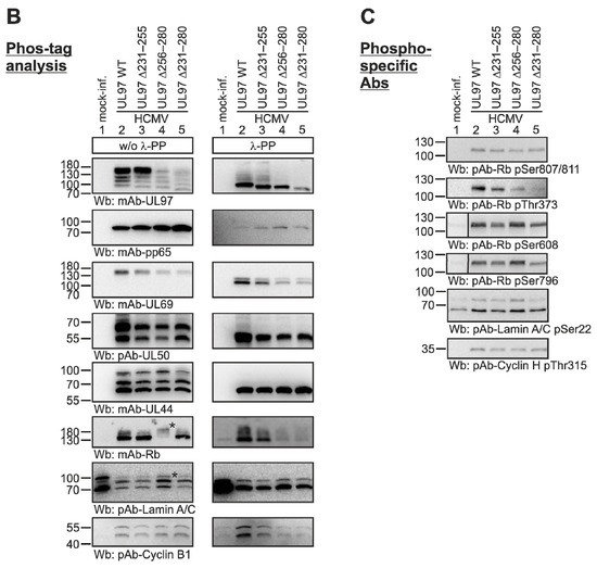 As a second readout of phosphorylation patterns, the Phos-tag system of Wb detection was used, which reflects the occurrence of various phosphorylated forms of each individual protein (Figure 4B, left panels). A subtractive phosphorylated/nonphosphorylated analysis was achieved by the treatment of cellular lysates with λ-phosphatase prior to loading on SDS-PAGE for Wb detection (λ-PP; Figure 4B, right panels). The quantitation of the Phos-tag Wb bands was achieved by densitometry, in that the quotient of phosphorylated forms (upper three bands) towards the total protein amounts was determined for each virus. This procedure confirmed, mostly for the two deletion mutants, ∆231–280 and ∆256–280, the reduced levels of pUL97 autophosphorylation (68% ∆231–280, 81% ∆256–280, 93% ∆231–255, 92% HCMV WT; Figure 4B, lane 5), whereas pp65 phosphorylation appeared unaffected. In the case of pp65, the Phos-tag effect was clearly visible by the slower migration pattern (compare with MW markers in Figure 4A), and, due to the massive hyperphosphorylation of pp65, the λ-phosphatase reaction retained some residual faint bands, but no reduced phosphorylation levels were observed for the mutants. This difference in findings for pp65 shown in Figure 4A,B may result from a predominant defect of the deletions on the interaction pp65-pUL97, but a much lower effect on pUL97-mediated pp65 phosphorylation. An alternative explanation may be given by the possibility of additional pp65 phosphorylation through pUL97-independent kinases [22,56,57,58], which is less detectable by CoIP-based IVKA than by Phos-tag analysis. Three further viral early proteins, pUL69, pUL50 and pUL44, showed a modest reduction in phosphorylation signals, which again appeared mainly noteworthy for the mutant ∆231–280, since this refers to the possibility of a multifactorial basis of the replication defect (compare Figure 2). As far as the phosphorylation of cellular proteins was concerned, an upregulation was seen for specific phosphorylated varieties of retinoblastoma protein (Rb), nuclear lamin A/C (note asterisk) and cyclin B1, all representing known substrates of pUL97 activity [16]. Interestingly, a reduction in phosphorylation in these cellular proteins in correlation with the UL97 mutation was poorly observed, when considering the relatively strong effects seen for viral proteins. This points to the possibility that the overall catalytic activity of pUL97 is not fully destroyed through the deletions, but that phosphorylation defects may occur in a substrate-specific fashion. Notably, one distinct change in the qualitative pattern of Rb phosphorylation was noted for the mutant ∆256–280 (Figure 4B, panel of mAb-Rb, lane 4). The occurrence of an unusual phospho-specific band might indicate altered coverage of alternative phosphosites in Rb.