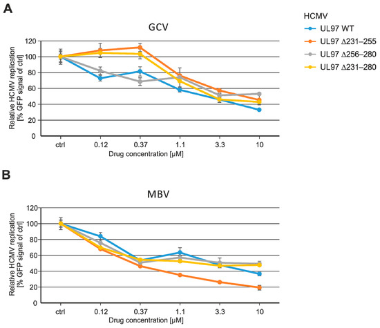 HCMV GFP-based replication assays were performed as described previously [49,50]. In brief, 200,000 HFFs were cultivated in 12-well plates for the infection with parental HCMV AD169-GFP or UL97 deletion mutants ∆231–255, ∆256–280 and ∆231–280 at a MOI of 0.25 GFP-FU/cell (i.e., 25% GFP-forming doses of a multi-round infection measured at 7 d) and treated with maribavir (MBV) or ganciclovir (GCV) at serial concentrations. At 7 d.p.i., the cells were lysed and total lysates were subjected to automated GFP quantitation using a Victor 1420 multilabel counter (Perkin-Elmer, Waltham, MA, USA). Mean values ± SD of quadruplicate determinations are given (infections in duplicates, GFP measurements in duplicate).