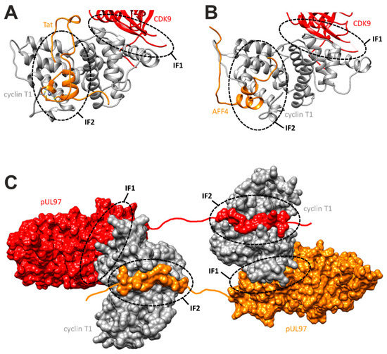 The experimental data above show the importance of the sequence stretch 231–280 of pUL97 for cyclin T1 binding. To understand the molecular principles of this interaction in more detail, we have analyzed the structures of known cyclin T1 complexes with various binding partners. This analysis illustrates that cyclin T1 exhibits at least two distinct surface regions that are involved in protein–protein interactions. One of these interfaces normally mediates the contacts with the globular domain of CDK9, interface 1 (IF1), whereas a second, less well-defined surface region, interface 2 (IF2), is able to bind to short sequence segments of regulatory proteins, such as the Tat protein of human immunodeficiency virus type 1 (HIV-1) or the cellular factor AFF4 (Figure 7A,B). CDK9 that binds via IF1 shares sequence homology with the pUL97 kinase domain (amino acids 328–655). Based on this homology, we have previously modeled the cyclin T1–pUL97(328–655) complex [29]. pUL97(231–280) resembles the known ligands of IF2, namely Tat and AFF4, both with respect to the length and the absence of a globular domain structure in the respective region [28]. In addition, the presence of several cysteines and histidines in pUL97(231–280) suggests that this protein might contain a zinc finger, similar to the respective region of the Tat protein (Figure 7A). These similarities render it likely that pUL97(231–280) binds to IF2, although the role of individual amino acids and the exact binding mode still need to be determined. Combined, these considerations suggest that pUL97(231–280) and pUL97(328–655) interact with cyclin T1 via two distinct interfaces. This conclusion allowed us to extend our previous model [29] by the cyclin T1–pUL97(231-280) interaction (Figure 7C). In this refined model, the presence of two interfaces also offers a structural explanation for the cyclin-mediated pUL97 self-interaction via the formation of higher-order complexes, e.g., via a tetramer formed by two pUL97–cyclin T1 heterodimers (Figure 7C). Given this heterotetrameric model, which may explain the overlap in our previous CoIP-based mapping of pUL97–cyclin T1 and pUL97–pUL97 interaction activities, the IF2-mediated interaction obviously exerts a dominant or stabilizing role over the IF1-mediated interaction. This is concluded from the finding that deletion of IF2 in the mutant ∆231–280 (both in the recombinant viruses and in the transient plasmid expression systems) led not only to a loss of pUL97–pUL97 oligomerization but also to a loss of a detectable level of pUL97–cyclin T1 interaction. Thus, IF1 alone appears not to be sufficient for mediating a stable pUL97–cyclin T1 interaction.