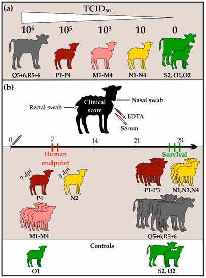 Experimental set-up and clinical outcomes: All animals involved in this study are visualized alongside with the corresponding infection doses in section (a). In section (b), the collected samples are presented together with the clinical outcomes of all infected animals. Whereas half of the sheep had to be euthanized due to human endpoints, all calves and the other six sheep survived the NSDV challenge.