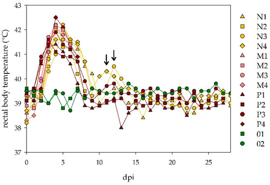 Rectal body temperatures of challenged sheep: all twelve infected sheep developed high fever following the NSDV inoculation, almost independent of the applied virus dosage. Two animals of the low dosage group (N3, N4) showed a second increase in their rectal body temperature (marked with arrows). The control animals did not develop an increase in their rectal body temperatures.