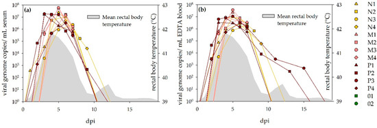 Viremia detected via RT-qPCR in sheep: Results for serum (a) and EDTA (b) are depicted, respectively. Both curves are comparable between the different dosage groups and sample sources. For two animals (P3, P4), virus was detected in EDTA blood for significantly longer than in the corresponding serum samples. The viremic state coincided well with the fever period (grey pattern).