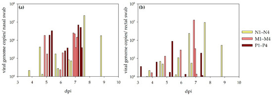 Virus shedding detected via RT-qPCR in sheep: results for nasal (a) and rectal swabs (b) are depicted. Viral RNA was detected as being steadier in nasal swab samples compared to rectal swab samples.