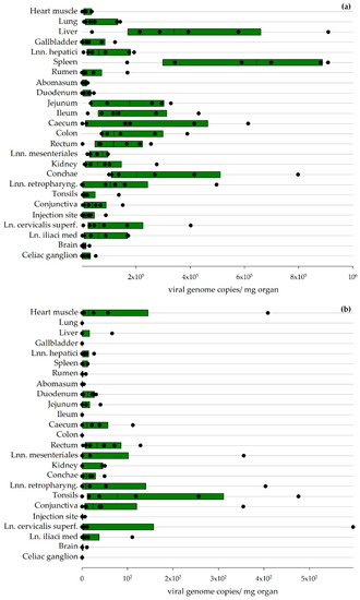 Viral organ loads detected via RT-qPCR in sheep: Results for sheep euthanized 7/8 dpi (a) and 27/28 dpi (b) are depicted. The boundaries of the boxes indicate the 25th and 75th percentiles, and the line within the box marks the median (calculation performed by Sigmaplot).