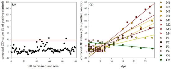 NSDV ELISA results for ovines: Panel (a) shows the results for 100 German ovine reference sera for the determination of the negative cut-off (illustrated by the red line; specificity, 97%). Panel (b) shows the results for the challenged sheep. Whereas the OD values for the control sheep (O2) stayed on the same level, linear regressions (calculation performed by Sigmaplot) show a steady increase in OD values for the infected sheep, which survived until the end of the observation period.