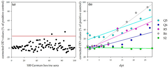 Calves: In total, 100 sera from German cattle were tested with the NSDV ELISA for the determination of the negative ELISA cut-off (mean + 3 × standard deviation = 26.0%, Specificity: 98%, Figure 7a). Linear regression of the results for the sera of the four infected calves show a steady increase during the observation period (Figure 7b). One calf was already tested as weakly positive prior to infection (Q5, 0 dpi, 31.5%), but reacted comparable to the other calves with an increase in OD values afterwards (26/27 dpi: Q5: 82.6%, Q6: 43.6%, R5: 50.7%, R6: 88.9%). The serum of this calf, analyzed one month earlier (prior to the purchase), did not test positive (Q5, −31 dpi, 5.7%). The time points, at which the negative cut-off value was passed by the individual animals, are listed in Table 4.