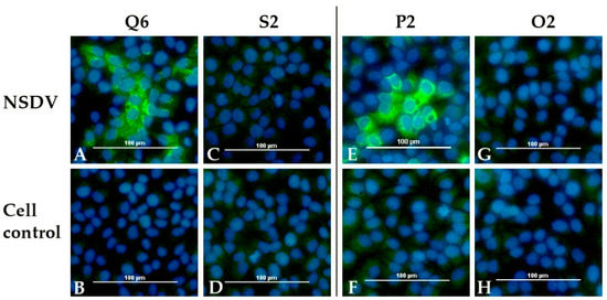NSDV immunofluorescence assay: Results for one infected calf (Q6) and one infected sheep (P2) are presented together with the results for the mock control animals (calf S2 and sheep O2). Specific staining is shown for both infected animals on cells infected with NSDV (Q6: A, P2: E). No signal was detected for the control animals (S2: C, O2: G) and for all animals for non-infected cells (Q6: B, S2: D, P2: F, O2: H).