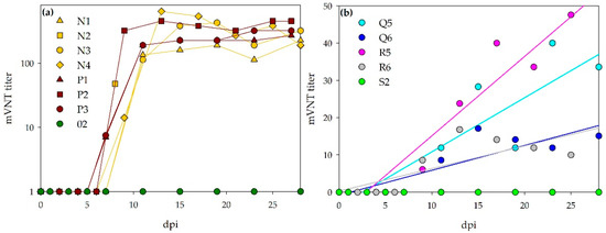 Course of mVNT titers: Panel (a) visualizes the rapid increase in mVNT titers for the infected sheep. Panel (b) shows the steady increase (linear regression, calculated by SigmaPlot) of mVNT titers for the inoculated calves. Attention has to be paid on the different axis scaling for bovines and ovines.