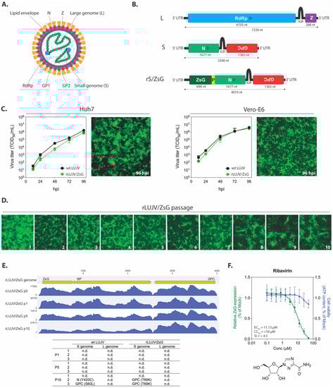 Design and characterization of rLUJV/ZsG. (A) Schematic representation of the Lujo virus (LUJV) virion; and (B) the LUJV large (L) and small (S) genome segments (antigenomic sense). Boxes represent the viral protein coding sequences (CDS) for RNA-dependent RNA polymerase (RdRp), Z matrix protein (Z), glycoprotein precursor (GPC), and nucleoprotein (N). Arrows represent the coding direction. The recombinant S genome segment (rS/ZsG) contains the ZsGreen1 (ZsG) CDS attached to the N CDS via a porcine teshovirus-1 2A (P2A; P in the figure) nucleotide sequence. GP1, glycoprotein 1; GP2, glycoprotein 2; UTR, untranslated region; IGR, intergenic region; nt, nucleotides. (C) Viral growth curves in Vero-E6 and Huh7 cells infected with either wild-type (wt) LUJV or rLUJV/ZsG at MOI 0.1. TCID50 titers were determined at 12, 24, 48, 72, and 96 h post-infection (hpi). Representative fluorescent microscopy images (10× magnification) of rLUJV/ZsG-infected cell monolayers at 96 hpi are presented. (D) rLUJV/ZsG was passaged 10 times in Vero-E6 cells, with representative fluorescent microscopy images presented (10 × magnification) of infected monolayers taken at time of passage (3–4 days post-infection). (E) NGS analysis of wt LUJV and rLUJV/ZsG passaged 10 times in Vero-E6 cells. Viral RNA analyzed at passages 1, 5, and 10 showed no changes in S genome segment coverage over the passages. The associated table indicates the non-synonymous mutations detected in the S genome segments of each of the 3 replicates at passages 1, 5, and 10 (n.d., none detected). (F) The rLUJV/ZsG fluorescence reduction screening assay was evaluated with the antiviral compound ribavirin. Reduction in ZsG fluorescence in Huh7 cells treated with a range of ribavirin concentrations 1 h prior to infection with rLUJV/ZsG at MOI 0.1 was determined, with fluorescence values normalized to mock-treated cells (DMSO only). Cell viability was assessed at each ribavirin concentration by measuring ATP content (green), and values were normalized to those of mock-treated cells. Each point represents the mean of quadruplicate wells, with error bars indicating standard deviation; graphs are representative of 2 independent experiments. Associated EC50, CC50, and SI values are provided, along with the chemical structure of ribavirin.