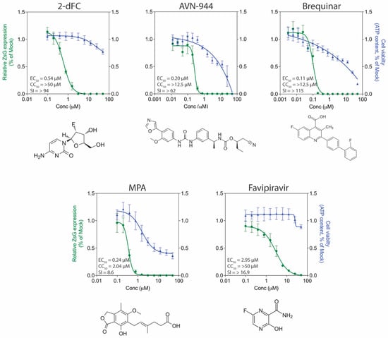 Antiviral activity of select compounds targeting viral replication processes. Concentration-response curves in Huh7 cells infected with rLUJV/ZsG (MOI 0.1) after being treated 1 h prior with 2′-deoxy-2′-fluorocytidine (2-dFC), AVN-944, brequinar, mycophenolic acid (MPA), or T-705. Relative ZsG expression is shown in green and cell viability in blue. Values were normalized to mock-treated (DMSO only) infected cells. Each point represents the mean of quadruplicate wells, with error bars indicating standard deviation; graphs are representative of at least 3 independent experiments. Associated EC50, CC50, and SI values are given, along with the chemical structure of each compound.