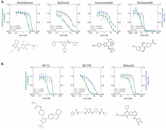 The compounds apilimod, niclosamide, and isavucanazole have all been shown to inhibit LASV entry in vitro [31,32]. Of these, the most potent inhibitor of rLUJV/ZsG was niclosamide (EC50 0.085 ± 0.029 µM, CC50 0.272 ± 0.034 µM, SI = 3.2) with a sub-micromolar EC50 value (Figure 3A). Of the other two compounds, apilimod (EC50 1.44 ± 0.6 µM, CC50 14.41 ± 3.2 µM, SI = 10) demonstrated greater inhibition than isavucanazole (EC50 6.1 ± 0.9 µM, CC50 12.69 ± 3.9 µM, SI = 2.1). Interestingly, the niclosamide values for rLUJV/ZsG inhibition are very similar to the reported EC50 of 0.08 µM for LASV inhibition in a pseudovirus screening assay; however, the same study reported an EC50 of 0.05 µM for apilimod against LASV, which is considerably lower than EC = 1.44 µM for rLUJV/ZsG [31]. Isavucanazole was shown to inhibit LASV (EC50 1.2 µM, CC50 > 30 µM) in an HIV-luc pseudovirus screen, but did not inhibit LUJV in the same screen [32]. Here, however, using rLUJV/ZsG, which better represents authentic viral replication, we observed a degree of inhibition using isavucanazole, which may indicate a mode of action different from blocking viral entry. Finally, amiodarone (EC50 4.90 ± 0.51 µM, CC50 13.63 ± 1.51 µM, SI = 2.8) is a cationic amphiphilic drug (CAD) that can accumulate within acidic intracellular vesicles, inhibiting membrane fusion and ribonucleoprotein release [33]. It can inhibit Ebola virus (EBOV) in vitro and in vivo [34,35], and has been shown to inhibit in vitro the new world arenavirus GTOV [36], SARS-CoV-1 [37], and hepatitis C virus [38]. While these four compounds all inhibited rLUJV/ZsG, the degree of cytotoxicity associated with all except apilimod reduced their respective SI values and resulted in a very narrow window of effectiveness.