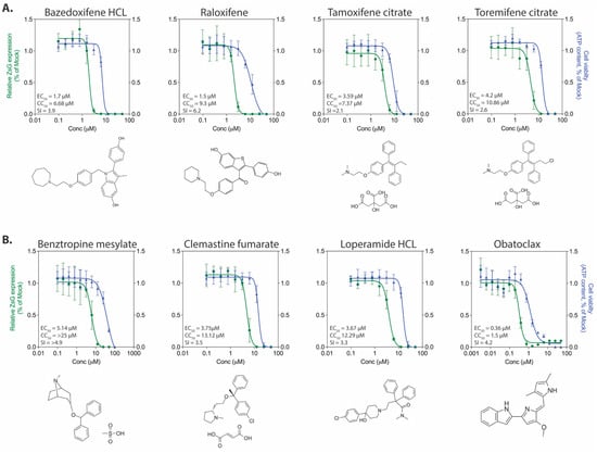 Four of the compounds in the screen were SERMs, a class of compounds that are also CADs and have antiviral effects against several viral species, including EBOV [45]. The SERM performing best against rLUJV/ZsG was raloxifene (EC50 1.5 ± 0.79 µM, CC50 9.3 ± 1.3 µM, SI = 6.2) (Figure 4A). Bazedoxifene HCl (EC50 1.72 ± 0.79 µM, CC50 6.68 ± 2.08 µM, SI = 3.9) demonstrated a similar EC50 value, but was associated with significant cytotoxicity, which reduced the SI values. Both tamoxifene citrate (EC50 3.59 ± 0.72 µM, CC50 7.37 ± 1.04 µM, SI = 2.1) and toremifene citrate (EC50 4.22 ± 0.78 µM, CC50 10.86 ± 3.14 µM, SI = 2.6) inhibited rLUJV/ZsG, but the associated cytotoxicity again led to a very narrow window of antiviral effect.