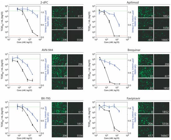 To confirm that the antiviral activity of the compounds was not specific to the ZsG-expressing recombinant virus, the top six candidates (SI ≥ 10) were selected to be screened using wt LUJV; these compounds were 2-dFC, apilimod, AVN-944, brequinar, BX-795, and favipiravir. These six drugs were tested using a shortened concentration curve (5 dilutions centered around their calculated EC50 value), with cell viability determined concurrently. All compounds evaluated inhibited wt LUJV titers in a concentration-dependent manner, and all compounds reduced viral titers by approximately 4 logs while retaining >75% cell viability (Figure 5). These results further confirm the suitability of using a reduction of ZsG fluorescence in rLUJV/ZsG-infected cells as a convenient readout in place of wt virus infection.
