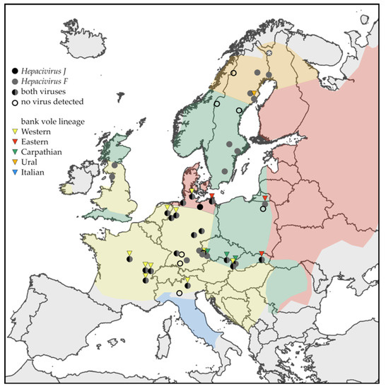 This study shows a broad geographical distribution of BvHV in bank voles across Europe. This is also reflected in the detection of BvHV RNA in bank voles of different evolutionary lineages. The high genetic divergence between both hepacivirus species and their sympatric occurrence in host populations at multiple sites clearly support their taxonomic classification as two distinct species, Hepacivirus J and Hepacivirus F. The influence of season on BvHV prevalence, but not of age, may suggest a varying transmission route (by vertical or direct contact) compared to other well-studied pathogens circulating in bank voles. Future investigations need to evaluate the role of additional lineages in the rodent host, for example, the Italian or Spanish ones, and the role of other Myodes vole species as possible reservoirs of BvHV, e.g., M. rufocanus and M. centralis in Asia or M. gapperi and M. californicus in North America. Finally, the multiannual fluctuation of bank vole populations warrants future investigations regarding the potential spillover of BvHV to other mammals and humans.