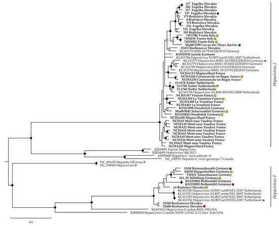 RNA extraction was performed using a phenol–chloroform protocol for liver or lung tissue samples of a large part of the sample collection, as previously described [25]. Another part of liver samples was homogenized in 500 µL phosphate-buffered saline (PBS). Here, RNA was extracted using Microlab Star automate (Hamilton Robotics, Reno, NV, USA) in combination with the Nucleo Spin 96 Virus Core Kit (Macherey-Nagel, Düren, Germany) according to the manufacturer’s instructions. For molecular screening, two different RT-qPCR assays were used for individual samples or for pools of six individuals: rodHCVeur assay [9] for Hepacivirus J, and RHV-NS3-Line4 assay [24] for Hepacivirus F. A subset of RT-qPCR-positive samples were then analyzed by conventional RT-PCR, targeting the NS3 gene, and amplification products were sequenced by dideoxy chain termination method (for primers, see Table S1).