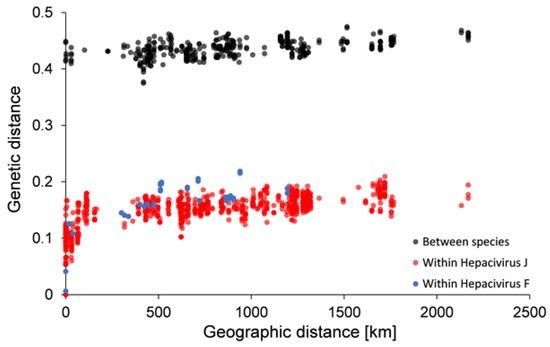 We detected, for both BvHV species, a positive association between genetic differences and spatial distance. These isolation-by-distance patterns are similar to the patterns observed in bank vole-associated PUUV [36] or common vole-associated Tula orthohantavirus [41]. These associations can be explained by host dispersal occurring only at a local scale and the restriction of the accumulation of mutations in viral strains within local vole populations [42,43]. Over larger geographic distances, virus populations in each BvHV species thus evolve independently. However, in contrast to European hantaviruses [41,44,45], we detected both BvHV species in the same host populations in several regions of Europe, which suggests long-term co-existence of Hepacivirus J and Hepacivirus F in their host species.
