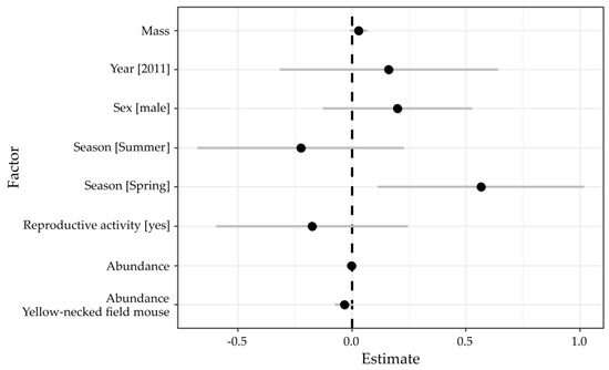 Graphical representation of the model averaging from all candidate models within an AIC of 2 of the best model (Models 1 to 14 in Table 4). Averaged mean estimates for all factors (black circle) and their 95% confidence interval (+/− grey line) are presented on the x-axis. For categorical factors, the reference categories are female (Sex), autumn (Season), the year 2010 (Year), and reproductive inactivity (No). Here, a factor can be considered significant if the confidence intervals do not include zero (dashed line).