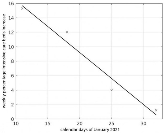 We report here some results on the influence of school reopening during January and February 2021 on the COVID-19 epidemic in Italy. Bed occupancy in ICU was already adopted by us as a parameter that can suitably measure the pandemic intensity and the COVID-19 timeline of clinical evolution, a disease that, from the stage of early infection to the full-blown symptomatic phase needing ICU admission, can develop in approximately one month [21]. The result of the linear fitting of the percentage weekly increase of ICU occupancy in terms of the time when the school group started is shown in Figure 1. It is noticeable how the percentage weekly increase diminishes approximately linearly as the time of school start is prolonged.