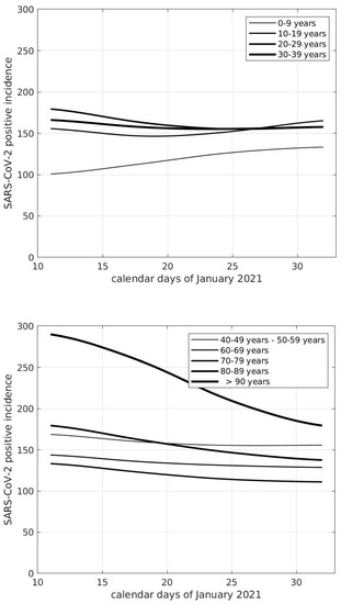 SARS-CoV-2 incidence curves were computed at the national level for the weeks from 11 January to 1 February 2021, and from 1 March to 18 April 2021, separately for the age groups 0–19, 20–29, 30–39, 40–49, 50–59, 60–69, 70–79, 80–89, and 90 or more years. We estimated the true value of the incidence by non-parametric linear regression [20]. Wilcoxon signed-rank test was performed to test the hypothesis about different curve patterns between groups.