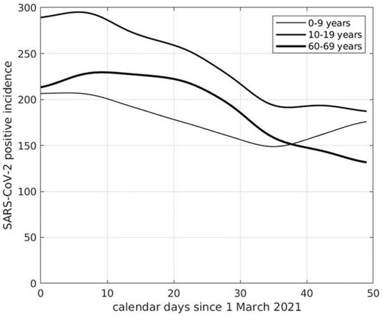 We now show results from the analysis of SARS-CoV-2 incidence data at the national level, providing evidence to support the hypothesis that also students younger than 11 years significantly contribute to the diffusion of the virus. In the top panel of Figure 2, we show the incidence curves of the age ranges 0–9, 10–19, 20–29, and 30–39 years. We notice that the curve for the range 0–9 years is increasing in the whole time-interval considered. The curve for the range 10–19 is the first to stop decreasing at about January 18. This happens roughly one week later for the curves of the ranges 20–29 and 30–39 years. The differences between the curve values in the first ten days of the time interval considered for the age group 0–9 years and the corresponding ones for each of the other three groups are statistically significant (p < 0.001). The curves for the ranges of people older than 39 years are shown in the bottom panel of Figure 2. As reported, ranges are decreasing in the whole time interval. It can be inferred from these results that the subjects first involved in the spread of the virus were those younger than 19 years, in particular, those younger than 10 years, mainly corresponding to students of primary schools. Similar findings are observed at the beginning of April 2021, as shown in Figure 3. The age range 0–9 years, in fact, was the only group showing increased SARS-CoV-2 incidence, a tendency that lasted up to the end of the month of April (not shown). In the second half of May 2021, COVID-19 cases showed a progressive and consistent decrease for any age category, a tendency that is still present in June at the level of every Italian region. This is probably due to the effects of restriction measures, the vaccination campaign, and the end of school activities. An additional contribution could be the increased social activities in the open air, where aerosol is absent, with consequent lower virus transmission probability.