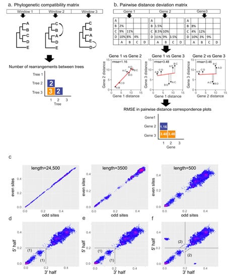Two approaches were used for recombination analysis. The preliminary analysis of recombination patterns in separate genera was performed by computation of phylogenetic compatibility matrices [,] implemented in RDP4 software []. This method infers phylogenetic trees for different genomic regions using a sliding window and calculates the phylogenetic incongruence (Robinson-Foulds distance) between them (Figure 1a). The sliding window size was 600 nucleotides (nt) and the step size was 100 nt.