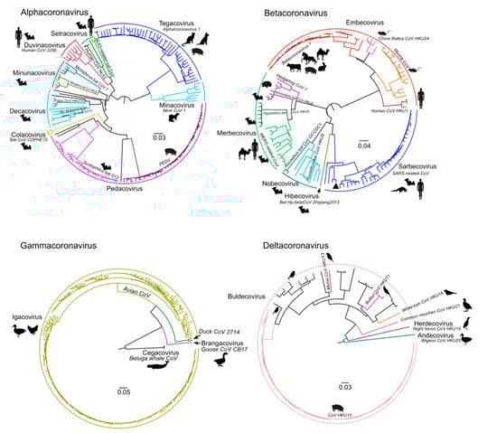 Coronaviruses are ubiquitous viruses infecting mammals and birds. They belong to the family Coronaviridae and are divided into four genera, Alphacoronavirus (α-CoV), Betacoronavirus (β-CoV), Gammacoronavirus (γ-CoV), and Deltacoronavirus (δ-CoV). Coronaviruses (CoV) are an important source of emerging infections due to their capacity to switch hosts and establish infections in novel host species [,]. Members of the genera α-CoV and β-CoV exclusively infect mammals, while γ-CoV and δ-CoV infect mainly birds, although they have also been found in cetaceans and pigs. Phylogenetic studies suggest that bats are the major source for α-CoV and β-CoV infection of other mammals [,]. Analysis of bat coronaviruses in China showed that α-CoV change hosts more frequently than β-CoV [], and host-switching occurs between more distantly related bats. However, β-CoV is more relevant as a source of threatening novel human viruses, including SARS-CoV-2 [,,]. Wild birds are the reservoir hosts for highly diversified γ- and δ-CoV [].