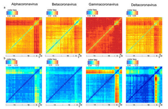 Recombination incidence in coronavirus genome detected by phylogenetic compatibility matrices based on normalized Robinson-Foulds distances (a) and pairwise distance deviation matrices (PDDM) based on deviations of points in PDCPs (b) for four Coronavirus genera. Spike gene is visually more involved in recombination relative to the rest of the genome in the four CoV genera. Colors reflect the values of normalized Robinson-Foulds distances and RMSE in PDCPs, respectively.