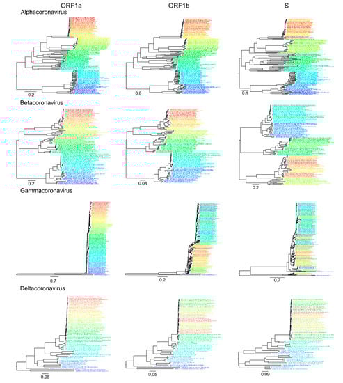 The trees of ORF1a, ORF1b, and S nucleotide sequences were inferred using IQ-TREE with 10,000 pseudo-replicates, incorporating the best-fit model of nucleotide substitution, and rooted by midpoint for each genus []. The automatic coloring of taxa labels in ORF1a, ORF1b, and S trees was performed using a Python script (https://github.com/v-julia/coronavirus_recombination, accessed on 25 June 2021). Trees were visualized with FigTree v1.4.4 [].