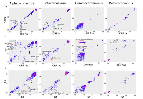 PDD matrices (Figure 3b) suggested a moderate prevalence of recombination within ORF1 in all four genera, with some potential hot-spots in ORF1a. PDC plots of ORF1a vs. ORF1b confirmed that the recombination level was moderate in α-CoV and β-CoV (Figure 5a), as also seen in the phylogenetic trees (Figure 4). There was evidence of a number of recombination events within ORF1ab, for example, between isolates of the species Alphacoronavirus 1 infecting different animal hosts (Figure 5a, black circles) and between members of Miniopterus bat coronavirus HKU8 (Figure 5a, red circle). Additionally, there were several recombination events within the species Murine coronavirus (Figure 5a, green circles) and SARS-related coronavirus (Figure 5a, black circles), including recombination between SARS-CoV-2 and SARS-related coronaviruses from bats (bold black circle). However, in general, there was a fair correlation of genetic distances between ORF1a and ORF1b. Notably, even in the absence of distinct recombination events, actual pairwise distances were not always perfectly correlated (here and below) as in the model data (Figure 1c). This is compatible with the ubiquitous moderate recombination suggested by PDD matrices (Figure 3b), phylogenetic trees (Figure 4), and with PDC plots using smaller genome regions that suggested additional phylogenetic incompatibility (not shown, may be explored via online tool at https://v-julia.shinyapps.io/recdplot_app/, accessed on 25 June 2021). In γ-CoV, there was a cloud of genetic distance pairs below approximately 10%, suggesting a frequently and promiscuously recombining gene pool among closely related viruses (Figure 5), again compatible with the thorough mixing of related taxa between, for example, ORF1a and ORF1b, observed on phylogenetic trees (Figure 4). δ-CoV showed no recombination within ORF1ab, likely because recombination events suggested by PDD matrices involved only very similar viruses, as seen in phylogenetic trees (Figure 4), and were not distinguishable from noise in the PDD matrices. Concordant with the phylogenetic trees, in all genera, PDD matrices did not indicate recombination within ORF1 between very distantly related viruses within a genus, and all recombination events were suggested within species.