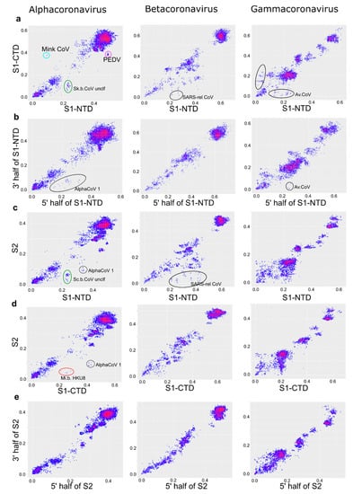 Recombination within domains of spike is less pronounced than between them. Correspondence of pairwise nucleotide distances in different regions of the spike protein: S1-NTD and S1-CTD domains (a), two halves of S1-NTD domain (b), S1-NTD domain and S2 region (c), S1-CTD and S2 region (d), two halves of S2 region (e). AlphaCoV 1, Alphacoronavirus 1; Mi.b.HKU8, Miniopterus bat coronavirus HKU 8, Sc.b.CoV 512, Scotophilus bat coronavirus 512; SARS-rel. CoV, SARS-related coronavirus; Av.CoV, Avian coronavirus. Points that correspond to virus pairs that underwent recombination and are discussed in the text are marked with circles.