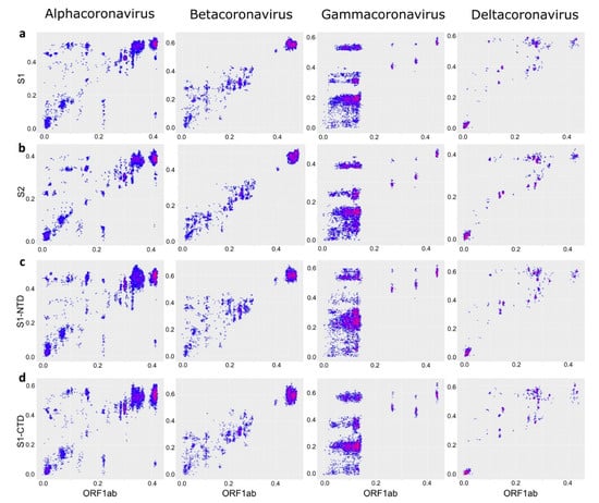 PDD matrices suggest a distinct recombination profile in the β-CoV spike (Figure 3). Distinct recombination patterns were observed among CoV genera between different domains of spike (Figure 6). However, comparing just spike regions could be misleading regarding the direction of such transfers. Correspondence of pairwise nucleotide distances between ORF1ab and different regions of the spike protein confirmed that S1-NTD was indeed the most mobile part of spike relative to the rest of the genome in β-CoV, as indicated by more deviating pairwise distances and higher deviations, especially compared to the ORF1ab:S2 plot (Figure 7). In other genera, patterns were very similar when comparing ORF1ab to distinct domains of spike, confirming that spike is commonly exchanged as a whole.