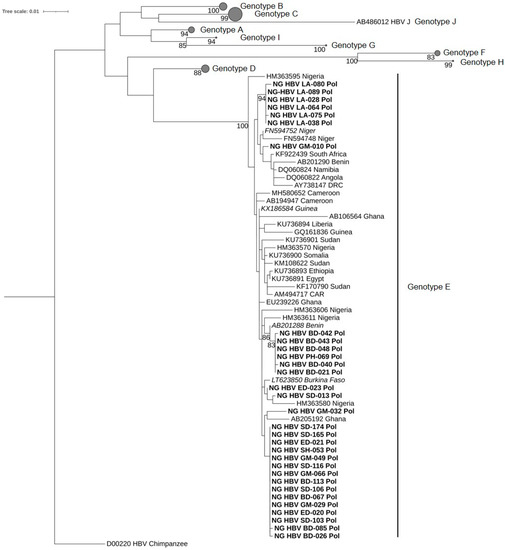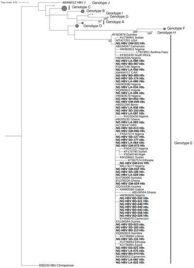 Phylogenetic analysis inferred using the maximum likelihood method based on the TIMe-+I+G4 model reconstructed from a 1014-bp-long fragment of the partial HBV Pol gene region. All 31 sequences obtained from this study were assessed as genotype E. The HBV sequences from this study are indicated in bold, whereas the best BLASTn matches are indicated in italics. HBV reference genomes of genotypes A–D and F–J are collapsed, with the size of the gray circles being proportional to the number of reference sequences. Bootstrap values >75% are indicated.