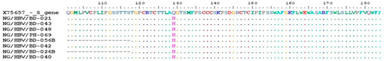 The mutational analysis of the partial HBs and Pol gene sequences revealed the presence of the escape mutation Q129H in eight HBV isolates sequenced in this study (Figure 3). In total, the sQ129H IEM was detected in 18.2% (n = 8/44) of the individuals with available sequence. Where available, the longer Pol gene sequence was submitted, otherwise the HBs gene sequence was used. The sequences with accession numbers MZ398363 (BD-021), MZ398364 (BD-042), MZ398365 (BD-043), MZ398366 (BD-040) and MZ398367 (BD-048) MZ368887 (BD-026B), MZ368888 (BD-056B), and MN819056 (PH-069) have the sQ129H mutation on the HBs part. Statistical analysis showed a correlation of the observed IEMs with sample location (p = 0.00) but not the categories of study participants (p = 0.06).