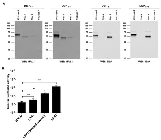 Nanoparticles were incubated with neuraminidase A (Neu A, New England biolabs, Inc., Beverly, MA, USA), neuraminidase S (Neu S, New England biolabs, Inc.), or PNGase F (New England biolabs, Inc.) at 37 °C for 18 h. Proteins were transferred to a polyvinylidene fluoride membrane (Thermo Fisher Scientific, Waltham, MA, USA). After blocking with 5% (w/v) bovine serum albumin in Tris-buffered saline with 0.05% TWEEN 20 (TBST) for 1 h at 25 °C, membranes were probed with monoclonal mouse anti-flag (1:1000, Sigma-Aldrich, St. Louis, MO, USA) antibodies, biotinylated Sambucus nigra agglutinin (SNA, Vector Laboratories, Burlingame, CA, USA), or biotinylated Maackia amurensis lectin-I (MAL-I, Vector Laboratories, Burlingame, CA, USA) as a primary staining, and then with horseradish peroxidase-conjugated goat anti-mouse IgG (Bioss Antibodies, Woburn, MA, USA) and streptavidin at 1:5000 dilution in TBST. Membranes were developed using ECL substrate (Thermo Fisher Scientific, Waltham, MA, USA) and signals were detected with Fusion Solo X (Vilber, Paris, France).
