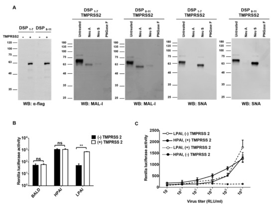 Additional proteases induced LPAI-mediated nanoparticle fusion. (A) Nanoparticles expressing DSPs, sialic acids, and TMPRSS2 were grown in HEK293T cells and incubated with neuraminidase A (Neu A), neutraminidase S (Neu S), or PNGase F for 18 h at 37 °C. Sialic acids expressions were detected using biotinylated SNA or biotinylated MAL-1. TMPRSS2 expression was detected using anti-flag antibody. (B) Nanoparticles expressing DSPs, sialic acids, and/or TMPRSS2 were incubated with HPAI, LPAI, or BALD pseudotyped viruses for 1 h at 4 °C. (C) HPAI and LPAI pseudotyped viruses were 10-fold serially diluted and then incubated with nanoparticles for 1 h at 4 °C. In all experiments, mixtures were adjusted at pH 5.0 and incubated with RL substrate for 10 min. Nanoparticle fusion was quantified by measuring RL activity. Error bars present SD from the mean (n = 3). Statistical significance was assessed by Student’s t test. **, p < 0.01; ns, not significant.