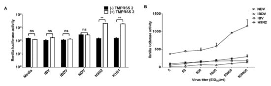 Finally, we tested whether authentic AI also induced nanoparticle fusion. As expected, both tested LPAI (H9N2 and H1N1) showed RL activity only in the presence of TMPRSS2 (Figure 4A). To investigate the sensitivity of the assay, serially diluted H9N2s were diagnosed using nanoparticle fusion assay. All H9N2s in the 5 to 5 × 105 EID50/mL range were positive in nanoparticle fusion assay (Figure 4B). The RL assay was negative for the samples including NDV, IBV, and IBDV (Figure 4). Our results indicate that the nanoparticle fusion assay have high specificity and sensitivity.
