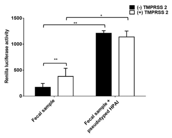 Nanoparticle fusion induced by fecal samples mixed with pseudotyped HPAI. Equal amounts of fecal samples and pseudotyped HPAI were mixed. Nanoparticles were incubated with mixed samples for 1 h at 4 °C. Mixtures were adjusted at pH 5.0 and incubated with RL substrate for 10 min. Nanoparticle fusion was quantified by measuring RL activity. Error bars present SD from the mean (n = 8). Statistical significance was assessed by Student’s t test. *, p < 0.05; **, p < 0.01.