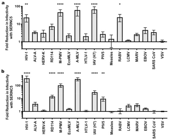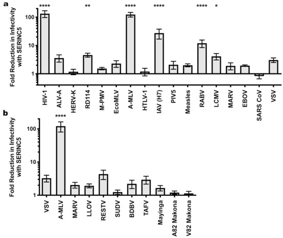 Sensitivity of MLV and M-PMV pseudotypes to SERINC5 antiviral activity. The effect of SERINC5 on the infectivity of glycoprotein pseudotypes using MLV (a) or M-PMV (b) cores was assessed as described in Figure 1. Plotted is the difference in infectivity between virus produced in the absence versus the presence of SERINC5 from at least three independent transfections. Statistical significance was determined via one-way ANOVA with Dunnett’s multiple comparisons post-test as for Figure 1. *, p < 0.05; **, p < 0.01; ****, p < 0.0001.