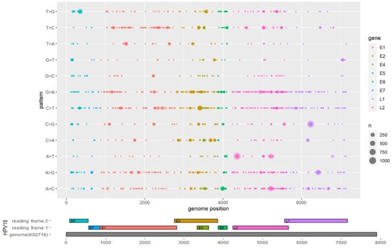 Mutation distribution across the HPV16 genome. The x axis shows HPV16 gene positions, and the y axis shows the 12 nucleotide mutation patterns. The bubble size indicates the occurrence of nucleotide mutations.