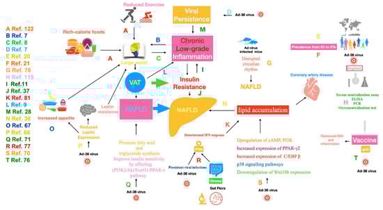 An intriguing hypothesis emerging from the data reviewed so far is that Ad-36 could be involved in the genesis of hepatic steatosis/NAFLD by reducing leptin gene expression—as feedback mechanism—and insulin sensitivity, by increasing glucose uptake, by activating the lipogenic and pro-inflammatory pathways in adipose tissue, and by increasing the level of macrophage chemo attractant protein-1, ultimately leading to chronic inflammation and altered lipid metabolism [].