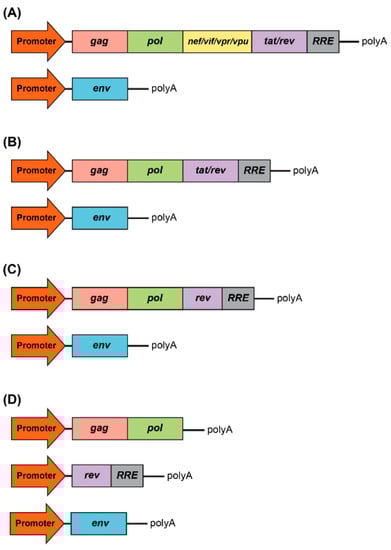 Development of packaging system for lentiviral production. (A) First generation included all accessory genes, nef, vif, vpr, and vpu, and the regulatory proteins, tat and rev. RRE is the rev response element. (B) Second generation excluded all accessory genes, nef, vif, vpr, and vpu. (C) Third generation excluded the tat regulatory protein. (D) Fours generation is characterized by the split of the gag/pol and rev sequences into two different cassettes, which evidently benefits the vector safety.