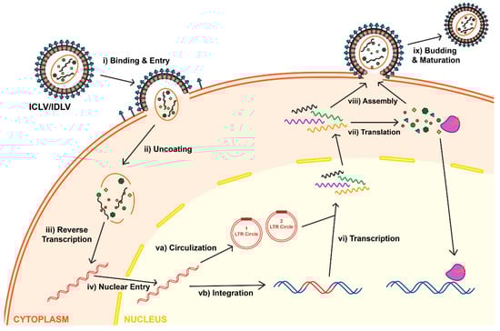 - Coffin, J.M.; Hughes, S.H.; Varmus, H.E. The Interactions of Retroviruses and their Hosts. In Retroviruses; Coffin, J.M., Hughes, S.H., Varmus, H.E., Eds.; Cold Spring Harbor Laboratory Press: New York, NY, USA, 1997. [Google Scholar]
