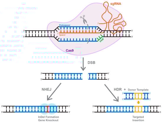 The overview of CRISPR/Cas system. Active Cas9 enzyme introduces a double-stranded break (DBS). The cell repairs through two methods, one of which is through non-homologous end joining (NHEJ) that create InDels. Alternatively, of a dsDNA donor template is provided, the DSB is repaired through homologous recombination (HDR), resulting in a targeted insertion.