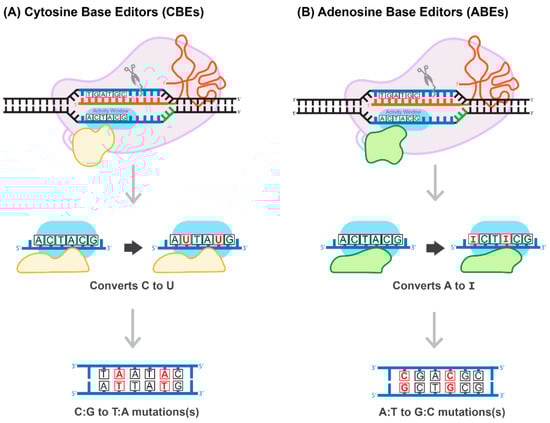Generally, the most common genetic variants associated with hereditary diseases in humans are point mutations and functional single-nucleotide polymorphisms (SNPs) characterized by high-level penetration []. Therefore, gene-editing systems capable of inducing a robust, efficient, and safe conversion on a single nucleotide level have the potential to cure many hereditary diseases. The construction of a cytosine base-editor (CBE) system by David Liu’s group was the first important development towards the establishment of such tools (Figure 6A). In the paper published by Komor and colleagues, dCas9 was fused with rat APOBEC1, a cytosine deaminase enzyme []. The resulting system induces conversion of all cytosines to uracils within an approximately six-nucleotide window, counted from the PAM-20 to the left (upstream). The uracil is then read as thymine during replication, completing the C-to-T conversion []. To overcome a caveat associated with the activation of base excision repair, catalyzing U-to-C re-conversion, the second generation of CBE carried a uracil glycosylase inhibitor domain to deactivate the base-excision repair pathway. This improvement greatly enhances the efficiency of the base editor. The use of nickase Cas9 (nCas9) to add cuts in non-edited strands further improved CBE efficiency. The new system has been coined BE3 and has been proven to be highly efficient in a variety of human cells, with a correction rate ranging between 25–75%. It is important to note that the nickase approach also results in an unwanted increase in the formation of InDels, from less than 0.1% to approximately 1% []. More recently, base-editing systems have been further enhanced. For example, Komor et al. created the BE4-Gam system, carrying a second copy of the uracil glycosylase inhibitor and a bacteriophage protein, Gam. Gam has a high affinity for the free ends of DSBs, thus preventing NHEJ-mediated repair and reducing InDel formation []. Koblan et al. inserted two nuclear localization signals (NLS), placing them proximal and distal to nCas9. In addition, they evolved a more efficient deaminase by constructing a codon-optimized version of the APOBEC domain, yielding BE4max and ancBE4max []. Other groups have focused on limiting or expanding the cytosine deaminase activity window, allowing for C-to-T conversions within a window as short as three or as long as twelve nucleotides [].