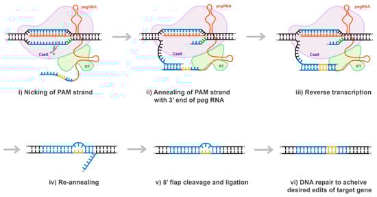Proposed mechanism of prime editing CRISPR/Cas technology. Once the 5’ end of the pegRNA (spacer) binds to the protospacer of the target DNA, the protospacer-adjacent motif (PAM) strand of the target DNA is nicked (i). The nicked PAM strand hybridizes with the primer binding site (PBS) on the 3’ end of the pegRNA (ii). The pegRNA serves as a template as the reverse transcriptase (RT) fused to the Cas9 enzyme extends the 3’ end of the nicked PAM strand (iii). The prime editing CRISPR/Cas system disengages and the target site is left with a 3’ flap (the edited PAM strand) and a 5’ flap (the original PAM strand) (iv). The 5’ flap is preferentially degraded by cellular endonucleases and the edited PAM strand ligases and hybridizes with the non-PAM strand (v). Finally, through DNA repair mechanisms, the desired edits of the target gene are transferred to the non-PAM strand (vi).