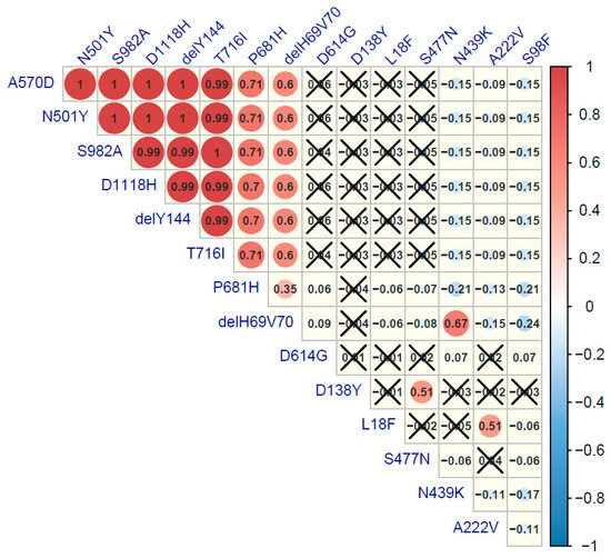 Correlation plot of major spike mutations in SARS-Cov-2 isolates from Poland. Positive correlations are displayed in red and negative correlations in blue. The color intensity and the circle size are proportional to the correlation coefficient values. Spearman’s rank test was performed, and a p-value ≤ 0.05 was considered as significant. Correlation coefficient values with greater p-value are cross-marked.