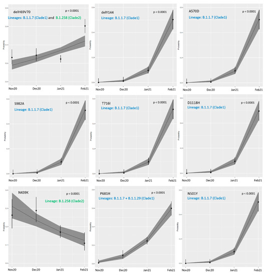 Two mutations, A570D and N501Y, were in perfect linkage; therefore, the increase in incidence from 0.88% in December to 51.32% in February (OR: 10.12, 95% CI 6.83–15.37, p < 0.0001) was the same. The last notable increasing trend was detected for D1118H, from 0.88% in December to 49.68% in February (OR: 9.90, 95% CI 6.83–15.01, p < 0.0001). Interestingly, only the frequency of N439K dropped, from 26.31 to 10.97% (OR: 0.68, 95% CI 0.57–0.82, p < 0.0001) in the analyzed months. Of note, when excluding the B.1.1.7 variant from temporal trends analysis, only four mutations (delH69V70, P681H, S98F, A222V) had a significantly different frequency from November 2020 until February 2021 (see Figure S5 and Table S4).