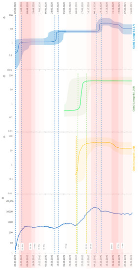 Bayesian skyline plot of the Polish SARS-CoV-2 outbreaks. (a) Clade 1 (lineages: B.1.1.*—for details see Supplementary Materials); (b) Clade 2 (lineage: B.1.258); (c) Clade 3 (lineage: B.1.221); and (d) registered cases of COVID-19 in Poland (https://www.gov.pl/web/coronavirus, accessed on 22 June 2021). For (a–c), the Y-axis indicates effective population size (Ne), and the X-axis shows the time. The thick solid line represents the median value of the estimates, and the shaded area the 95% HPD (highest posterior density). For (d), four different red color intensities exhibit the four-stage restrictive measures implemented by the government at the country level. White rectangles indicate dates of introduction/abolition of the restrictions.